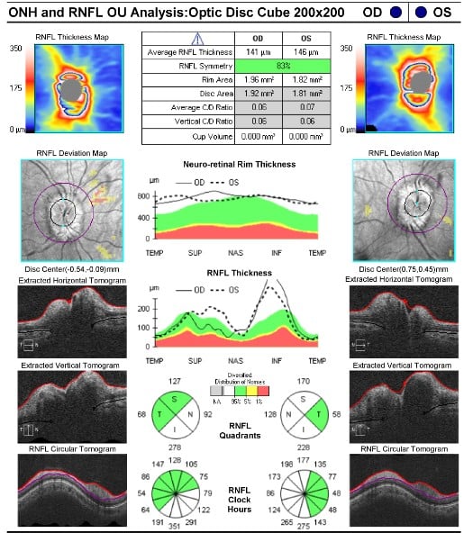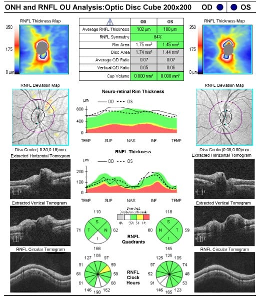 RNFL OCT was performed at this initial encounter confirming the bilateral papilledema noted upon exam (see image 1). Interestingly, upon careful questioning, the patient exhibited absolutely no symptoms related to papilledema. She had no history of head ache, no pain with ocular movement, no transient visual changes or blur, no diplopia.  There was no indication of this concern prior to her presenting for her comprehensive examination with her family eye clinician.