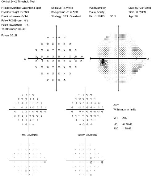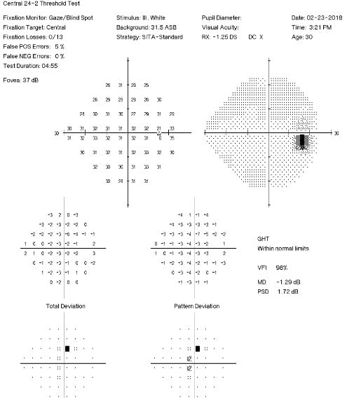 Visual field testing (see image 2 and 3) showed a very subtle enlarged blind spot OD, and mild non-pattern depressions OS. MRI with and w/out contrast of the brain and orbits was found to be normal other than evidence of papilledema.