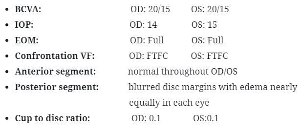 Idiopathic Intracranial Hypertension (IIH) seemed the most likely differential considering bilaterality and that the patient was moderately overweight. The patient was not presently pregnant, nor was she currently or recently taking oral contraceptives, hormones, tetracycline derivatives, or corticosteroids – all of which have been shown to be associated with IIH1,2.
